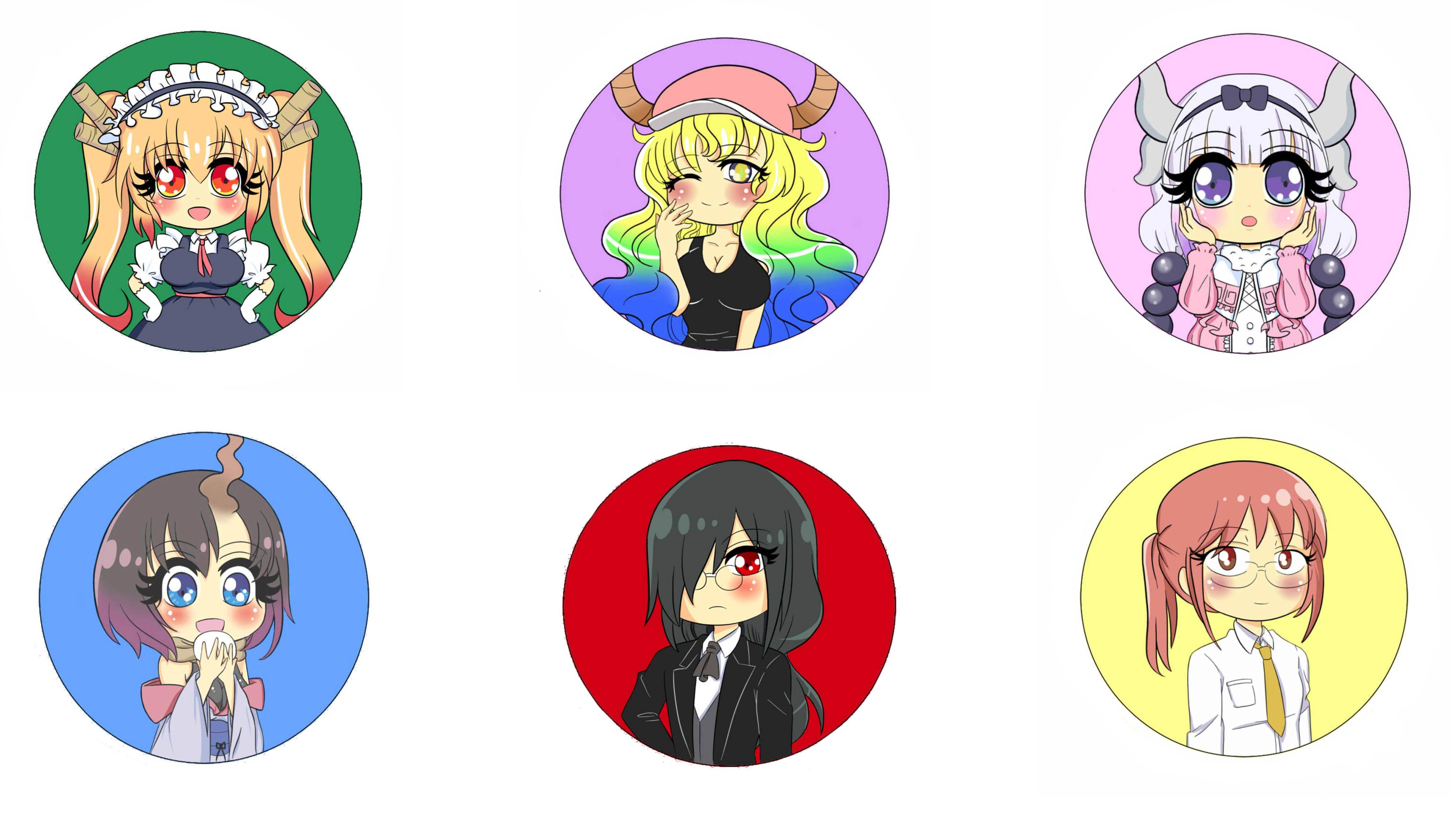2 1/4" standard pinback buttons of characters from Miss Kobayashi's Dragon Maid: Kobayashi, Tohru, Kanna, Lucoa, Elma, Fafnir