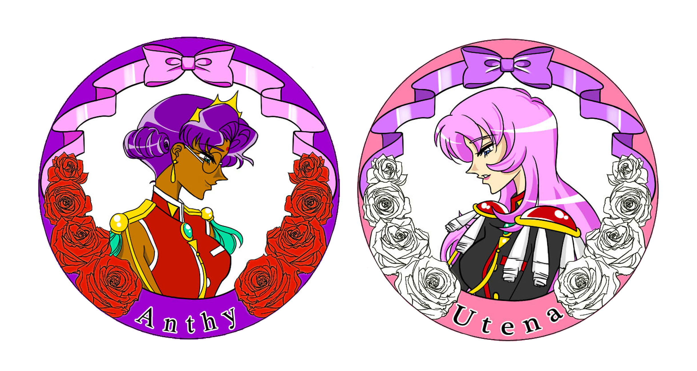 Size: 2 1/4 Standard pin-back round buttons featuring Utena Tenjou and Anthy Himemiya from the anime series Revolutionary Girl Utena.